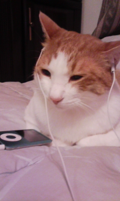 私が無理やり、耳につけたiPodのイヤホンつけてます。